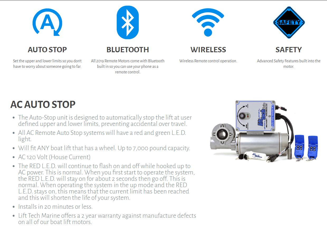 Easy and quick to install, Lift Tech Marine motor units available in AC and DC power options are packed with design features not found with competitors including remote control with bluetooth!